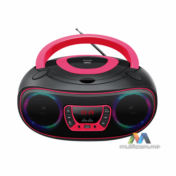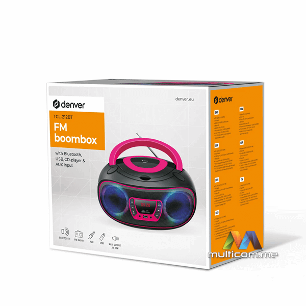 DENVER TCL-212BTP bluetooth zvučnik sa CD player-om │ Bluetooth povezivanje │ CD plejer i MP3 reprodukcija │ USB i AUX ulazi │ Prenosiv dizajn sa baterijskim napajanjem │ Snaga 2 x 2W │ Ugrađeni FM radio