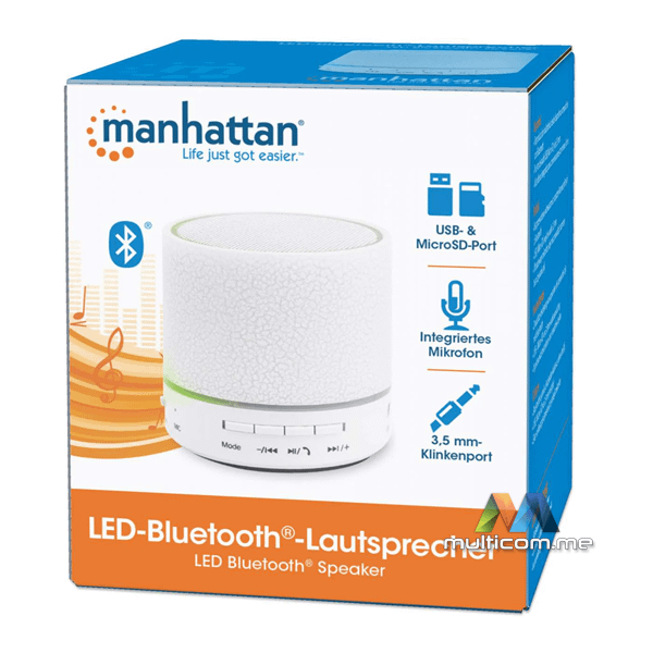 Manhattan LED Bluetooth zvučnik │ Bluetooth povezivanje │ USB/MicroSD MP3 podrška │ 3.5 mm AUX ulaz │ Ugrađen mikrofon │ Do 5h reprodukcije │ Kontrole na uređaju