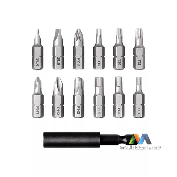 S2 visokokvalitetni čelični nastavci: Dvanaest nastavaka od S2 legiranog čelika, tvrdi i izdržljivi, sa produžnom šipkom od 60 mm.