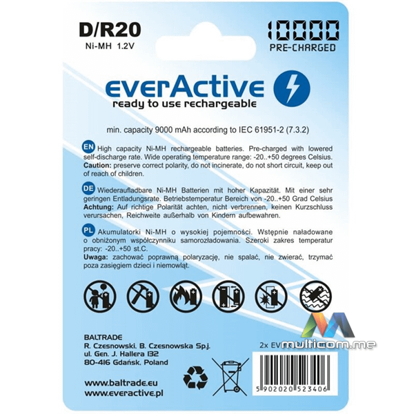 everActive R20/D Ni-MH 10000 mAh punjive baterije │ Napon 1.2V │ Veličina D │ Kapacitet 10000 mAh │ 2 komada