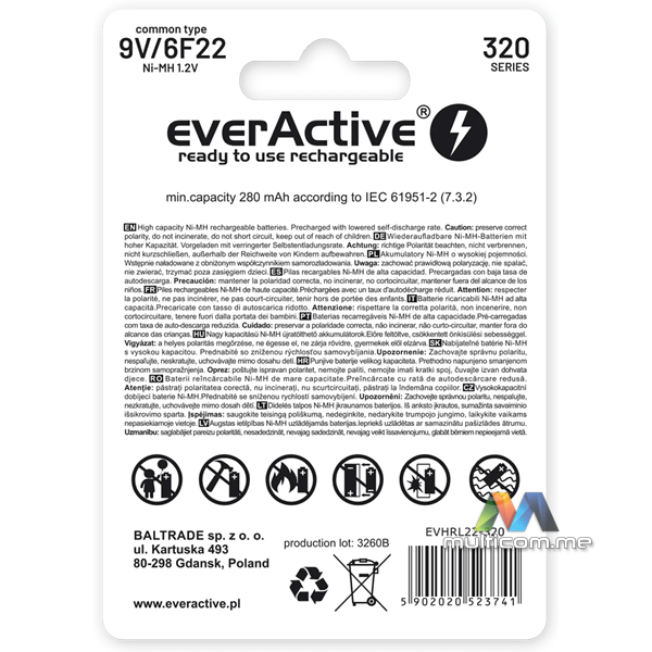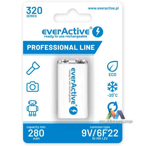 everActive Ni-MH 6F22 9V 320 mAh Professional Line baterija │ Nikl-metal hidrid (NiMH) tehnologija │ Punjiva baterija │ Napon 8.4 V │ Kapacitet 320 mAh