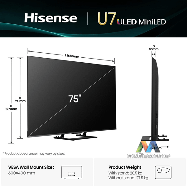 Hisense 75U7Q televizor │ Dijagonala ekrana: 75 inča (189 cm) │ ULED Smart TV │ 4K Ultra HD rezolucija │ Dolby Atmos │ DTS Virtual X │ VIDAA Smart OS │ Mini-LED tehnologija │ Hi-View AI Engine │ 144Hz Game Mode PRO