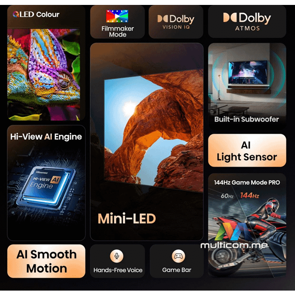 | Hisense tehnologije (AV/TV) | 144Hz Game Mode Pro, Dolby Vision™ IQ, MEMC (Motion Estimation Motion Compensation), Quantum Dot Colour |