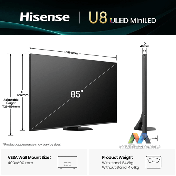 Hisense 85U8Q smart TV pametni televizor │ Mini-LED PRO │ Hi-View AI Engine PRO │ 165Hz Game Mode Ultra │ 4.1.2 Višekanalni Surround Zvuk │ VIDAA Smart TV