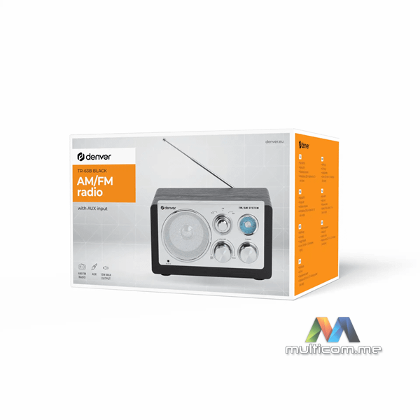 Denver TR-63B AM/FM Radio sa AUX ulazom │ AM/FM analogni radio │ Teleskopska FM antena i ugrađena AM antena │ Rotaciono dugme za jačinu zvuka │ Maksimalni izlaz od 15W │ Napajanje od 230V ili 4 x AA baterije
